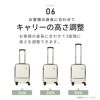 TIERRAL TORERU(トレル)は、ボディの前面が開くフロントオープンポケット搭載した、ハードタイプの高機能キャリーケースです。 スーツケースで1番壊れやすい箇所は、キャスターですが、名前の通りキャスターが取り外せるので、壊れてもリペアホイール(別売り)を使用して簡単に交換できます。外出から戻ってもキャスターを外せるので、お手入れ簡単で清潔にすっきり収納できます。本体には最新素材の「PET樹脂」を使用。 弾性に秀でたPET樹脂は耐衝撃性に強く、加えて高級感のある発色が特徴の素材です。4輪静音ダブルキャスターで路面を選ばずにスムーズな走行が可能です。荷物が重い時や混みあう場所は4輪で、デコボコした道では本体を傾けて2輪で状況に応じた走行が可能です。キャリバーの高さは3段階に調整が可能で、自身の身長に合わせて調整して頂けます。Sサイズは1~3泊程度の旅行に適したサイズで、機内持ち込み対応です(泊数は目安としてご利用下さい)。