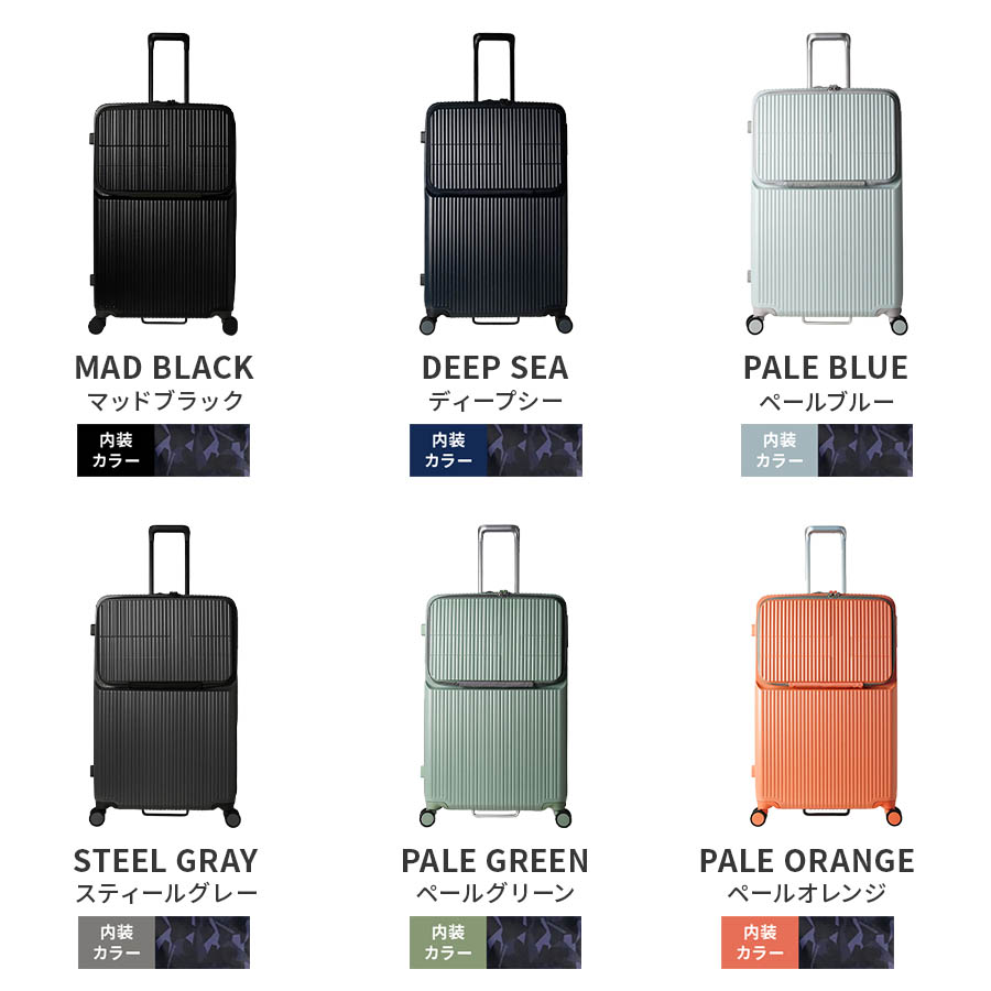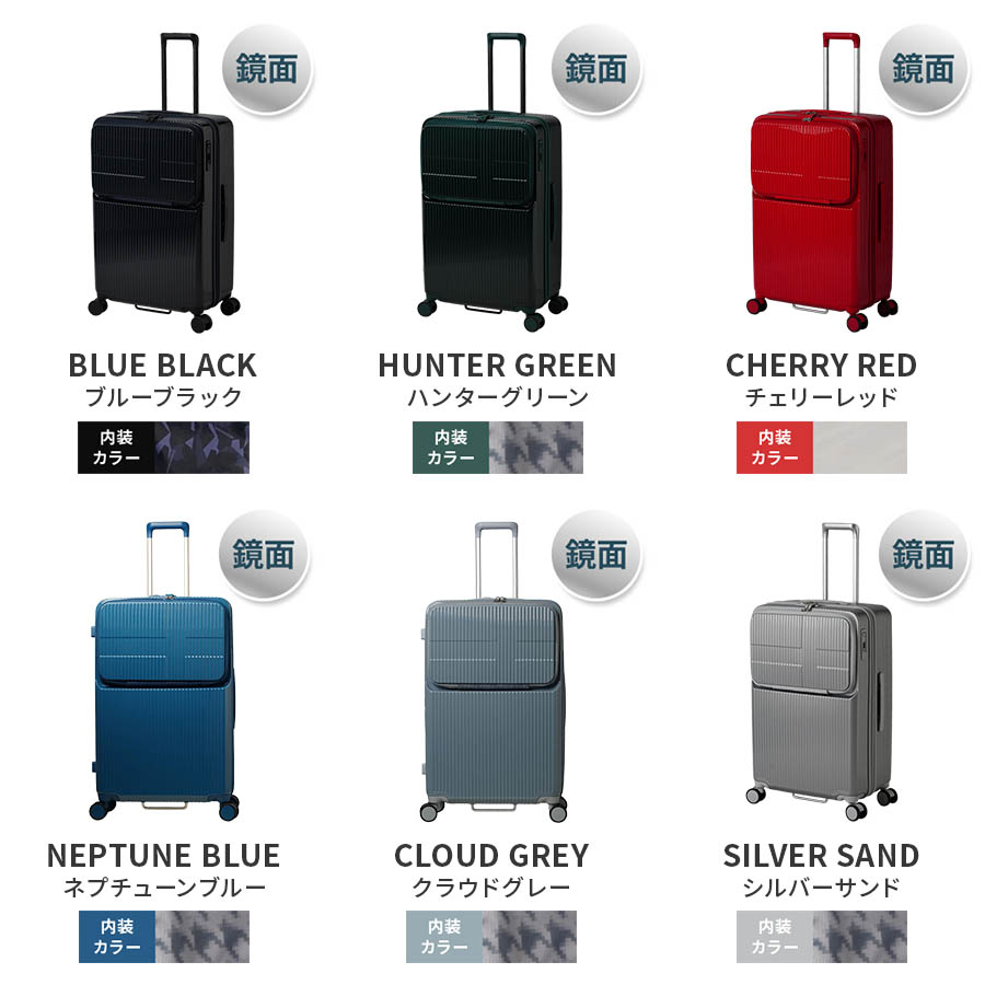 新幹線・バスなど乗り物移動で使いやすい トップオープンポケット+ブレーキキャスター付き のミドルサイズのスーツケース。荷物多めの旅行にぴったりです。・移動中に使う小物アイテムなどは トップオープンポケットへ。ファスナー仕切りを開けたその奥に、さらに荷物を入れることができます。・14インチのノートPCが収納可能なPCポケットです。その他にファスナーポケット、オープンポケットがあり、充電器などのアイテムを整理して収納できます。・ワンタッチでブレーキのオン・オフが可能です。揺れが気になる電車やバスの移動時でのストレスを軽減します。・静粛性・耐久性・快適性に優れた Lisof キャスター(日本メーカー HINOMOTO社製)を採用しています。360度回転する 双輪キャスターで安定走行性能をさらにアップしました。・フロントファスナー と メインファスナーを同時にロックできるダブルダイヤルロックです。TSAに承認されたロックの為、TSA対応国へ渡航の際も鍵を掛けたまま預け入れができ、安心です。・ボトムハンドルは荷物を詰めて重たくなったスーツケースの車両トランク・荷棚への積み込みをサポートします。・軽量で強度のあるアルミニウム素材のキャリーシステム。お好みの高さにあわせて3段階調節が可能です。外付けされたキャリーシステムはデザイン性にプラスして、ボディーの強度アップの効果もあります。・軽量で強度のあるポリカーボネート素材を使用しています。表面は、キズが付きにくい特殊なエンボス加工を施しています。・内装の片面(左側)は、荷物を分別収納できる様、2分割の収納方式です。メッシュ生地となっている為、中の荷物も確認できます。・つまみやすいファスナープラーで荷造りもスムーズになります。・付属のオリジナルポーチは、日本発国際線の航空機客室への液体物持ち込み規定に対応しています。■スーツケースメーカー2年間保証保証期間内に、通常使用において不具合が生じ、製造工程や部品などに問題や欠陥があったとみなされた場合、無償にて修理 または 交換をさせて頂きます。※保証にあたり、保証書(購入店・購入日 記載)、レシート、領収書、運送会社の伝票等が必要になります。※免責事由につきましては、付属の保証書をご確認下さい。TSA保証TSAロック対応国へ渡航の際、TSA職員により鍵を破壊され故障した場合には、無償で修理を承ります。※TSA職員が解錠検査した場合は、必ず「検査証明書」が入っています。修理の際は検査証明書が必要になります。※鍵破壊にのみ保証が適用されますので、それ以外の破損や損失は保証対象外となります。【商品詳細】品 番 : INV90サイズ : H74.5 x W48.5 x D29.5 cm(Total : 152.5 cm) 無料預入受託サイズ容 量 : 92 L重 量 : 5.1 kg材 質 : ポリカーボネートタイプ : ジップ