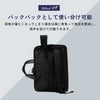 バックパックとしても使用可能な3ウェイバッグです。ブリーフケースとして使用する際には背面のショルダーストラップをポケットに格納可能です。また、エキスパンダブル機能搭載で出張など用途に応じて容量を拡張できます。付属のマルチポーチは取り扱い表記に従い洗濯が可能です。着脱式のショルダーストラップが付属しています。