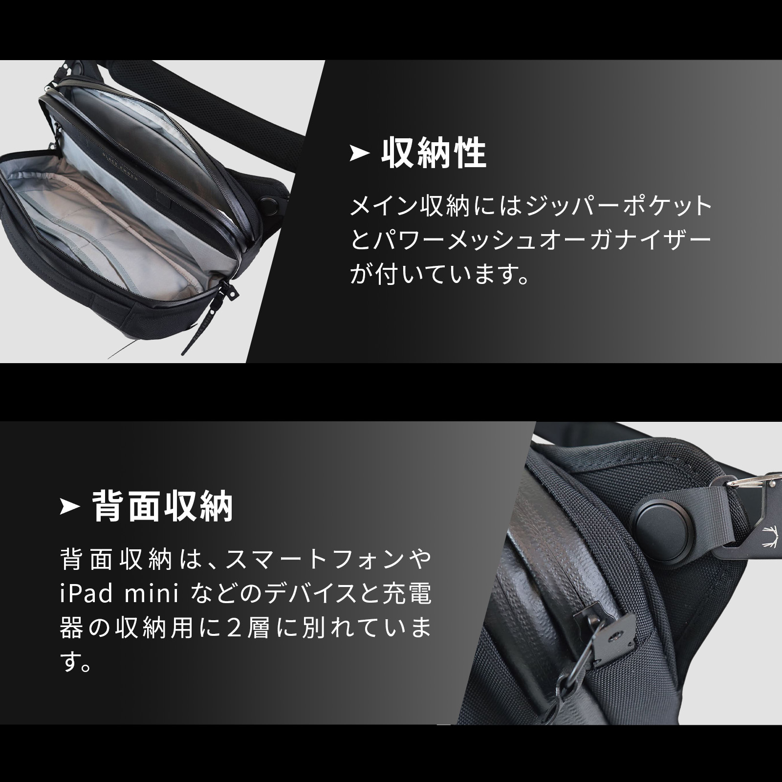 背面収納は、スマートフォンや iPad mini などのデバイスと充電器の収納用に2層に別れています。