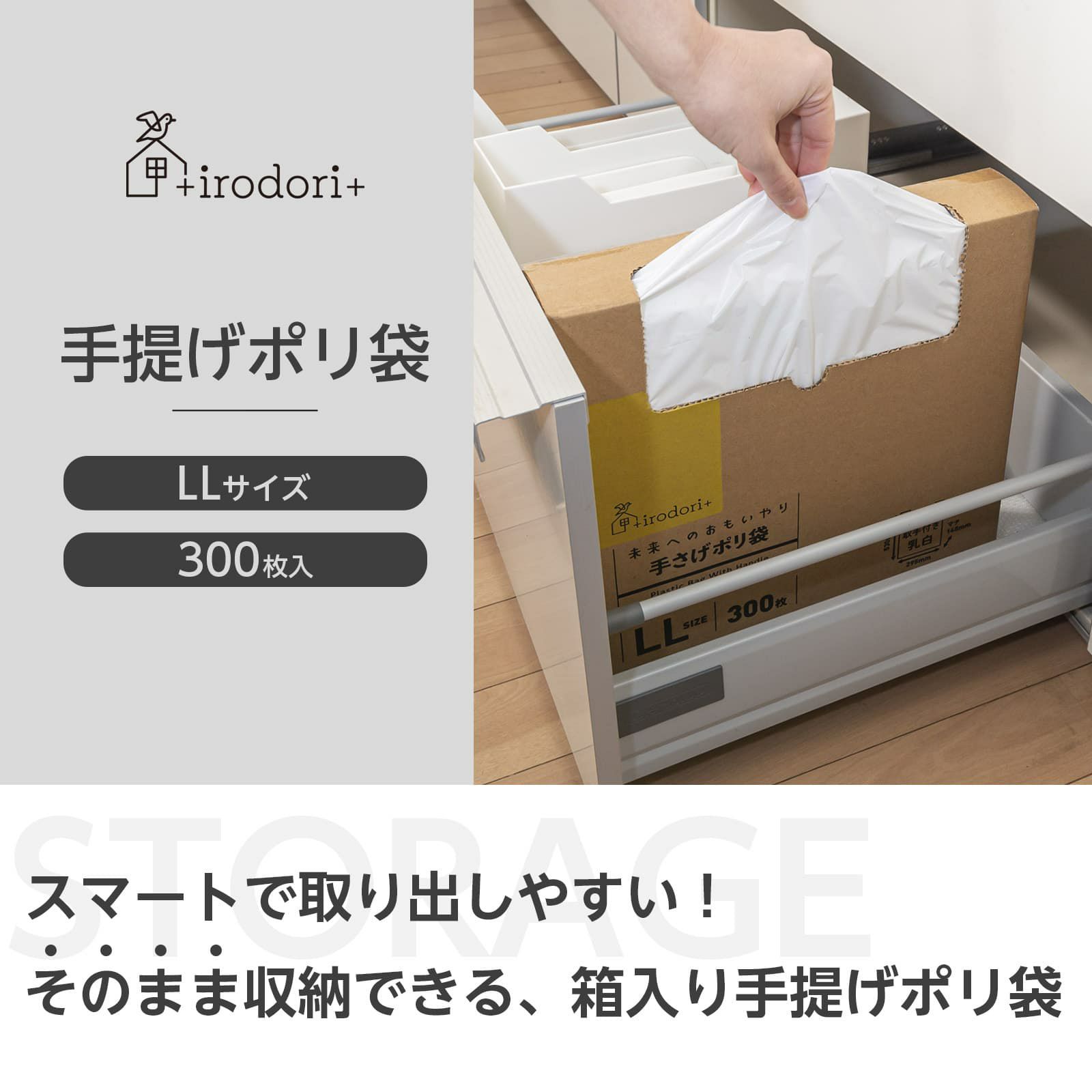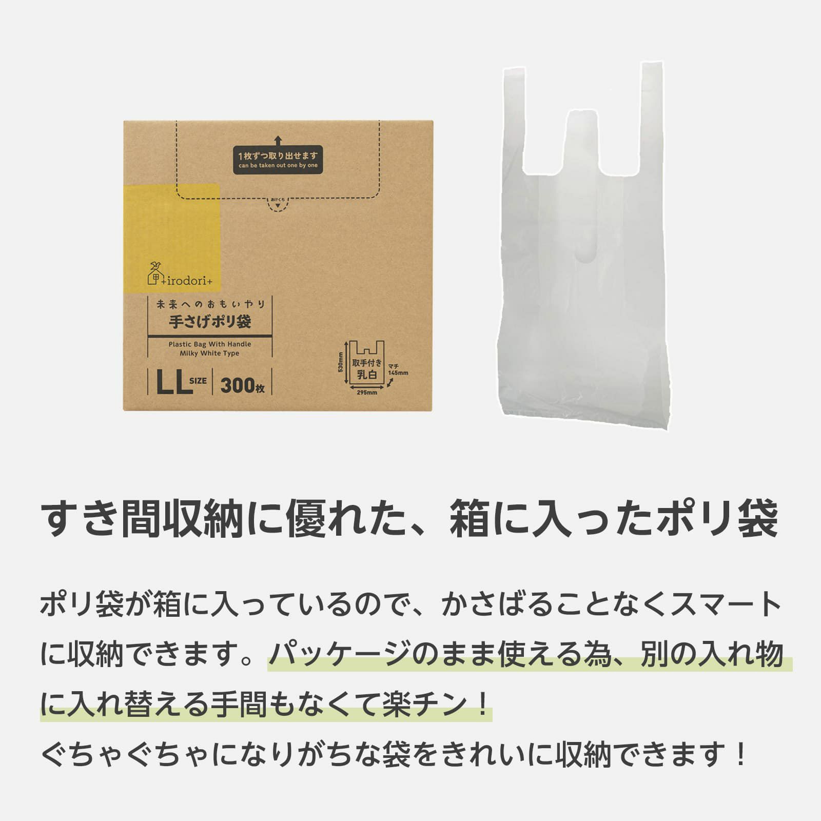 持ち帰りに便利なレジ袋や買い物袋、ごみ箱用、生ごみや日々のごみ捨てに。たっぷり300枚入った大容量タイプ。<シーンに合わせてサイズをチョイス>使用用途に合わせてお好きなサイズをチョイスしてください。<持ち帰り用に便利なレジバッグ・手提げ袋>持ち帰りに便利なレジ袋や買い物袋、ごみ箱用、生ごみや日々のごみ捨てに。たっぷり300枚入った大容量タイプ。<無料配布可能なバイオマス原料25%配合>ビニール袋ではない、バイオマス原料を25%配合している為、店舗様での無料配布が可能です。<「ふとした工夫で日々の生活を彩る」そんなブランドを目指しています>+irodori+は環境素材を使用、使いやすさ・収納性にこだわったアイテムを揃えました。日々の生活にちょっとプラスをお届けします。<地球と未来に思いやりを>サトウキビ由来のバイオマス原料を25%配合、パッケージに使用するインクにバイオマスインク使用。化石燃料の使用量を削減しさらにCO2の増加を抑制します。環境に配慮したエコロジーな商品です。また無料配布も可能です。日々使うもので未来への思いやりを!