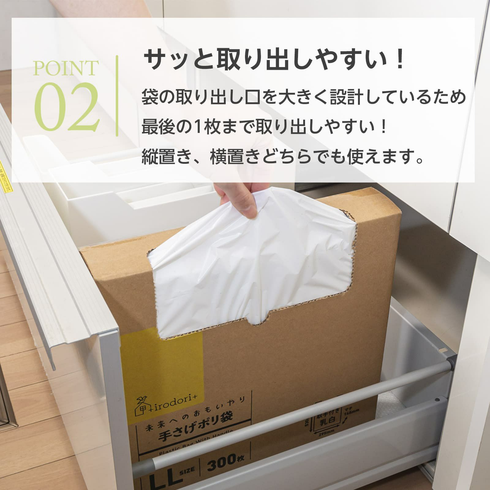 スリムな箱タイプ。冷蔵庫やごみ箱の横、引き出しや棚などにスッキリ収納できます。<収納方法・場所に合わせて横置き・縦置き自由自在>