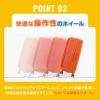 好奇心を満たすワクワクするような旅の気分を表現した「CURIO(キュリオ)」は、グルーヴィーなデザインが特徴のトラベルコレクションです。 ブックオープニングの3型は、衝撃を吸収することで凹凸のある道でも安定した走行性を発揮し、スムーズに移動をサポートするサスペンションホイールを装備しています。 また、ファスナーを開閉することで簡単に容量を調節することができ、旅先で荷物が増えても安心のエキスパンダブル機能も搭載しています。 回収したPETボトルを100%原料とする生地がつかわれた内装には、荷崩れを防止するクロスストラップと、小物収納用のポケットが付属しています。 ブックオープニング仕様のS,M,Lサイズはメイン収納部を広く・深くキープすることで厚みのある荷物でも楽にパッキングすることができます。 フタの部分にはファスナー付きのポケットも備えられており、小物類などがすっきりと収納することができます。 【商品詳細】 ・エキスパンダブルにより、容量を増やすことが可能です。(約16Lの容量拡張) ・ブックオープン仕様のため、蓋部分が重くならず、狭い場所でも簡単に開閉が可能です。 蓋部分にはポーチのようにマチのある収納がつくので、洗顔用品等を効率的に収納ができます。 ・OPTIMOVにより、タイル面や凸凹のある舗装道路など、細かな振動を吸収し、スムースな走行が可能です。 ・DUOSAFにより、通常のファスナーより開けづらい構造です。 ※務歯が二重になっていることでこじ開けにくい構造です。 ・SP66でスーツを入れたガーメントケースがジャストサイズとなります。 【商品仕様】 種類:ハードケース(ファスナー) キャスター:4輪 TSAロック:あり 多段階プルハンドル 容量拡張