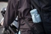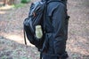 シリコンストラップには十分な強度があるので、カラビナをセットして、バッグとボトルを取り付けたりできます。