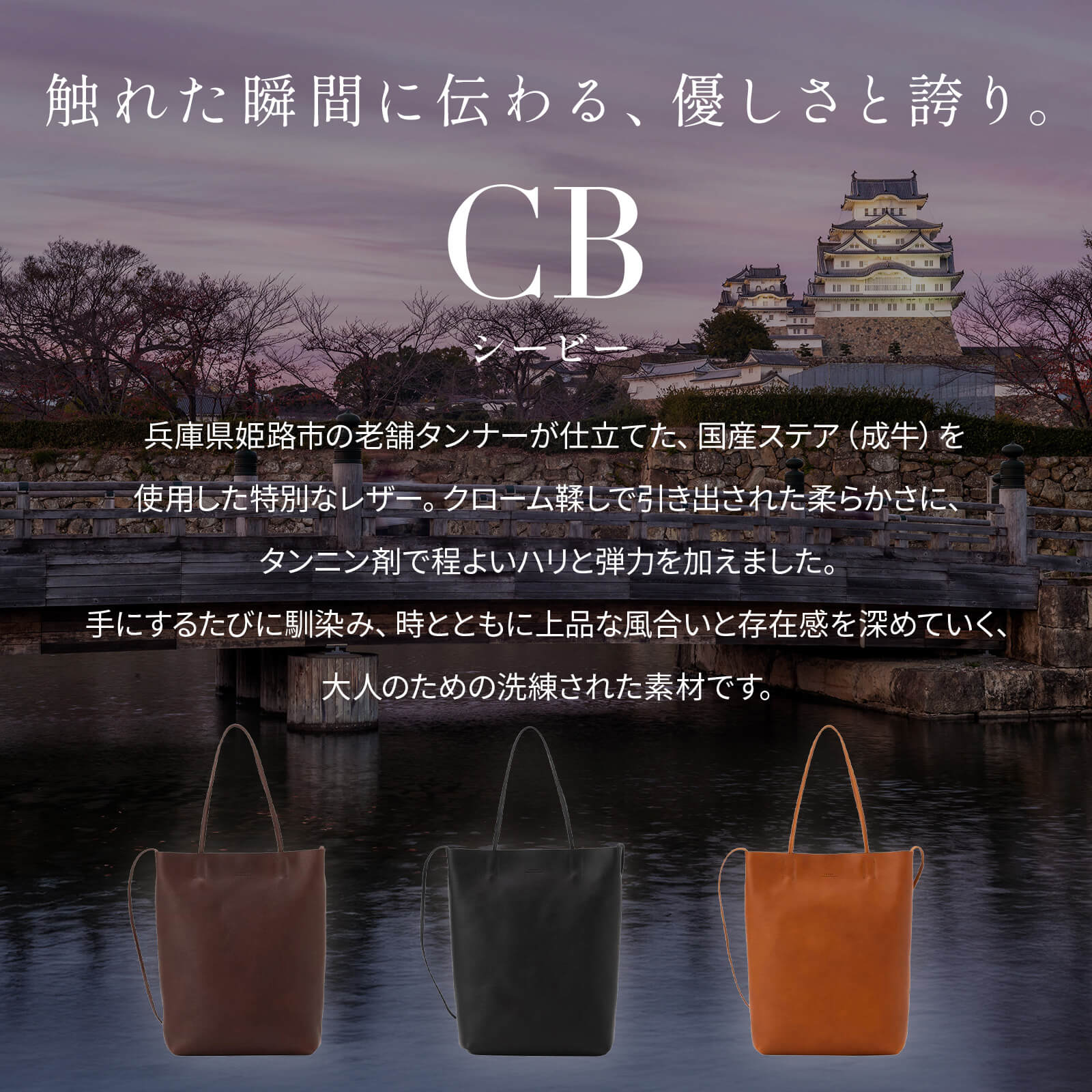 兵庫県・姫路市のタンナーにて国産の去勢されたステア(成牛)にクローム鞣しを施すことで柔らかくしなやかさを与えています。