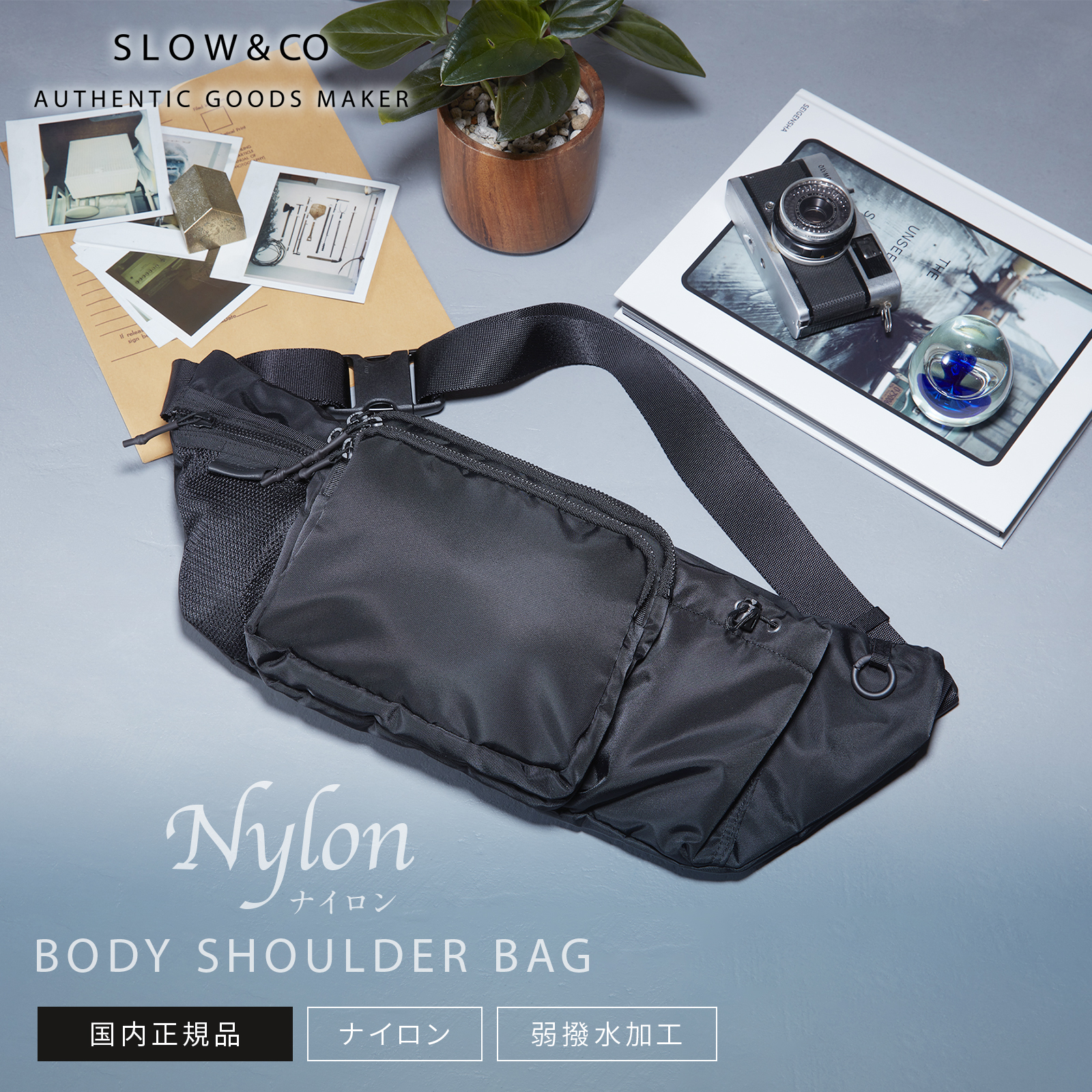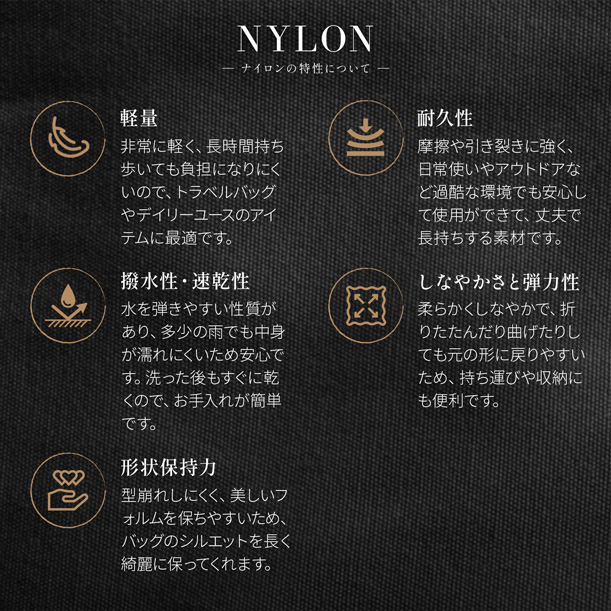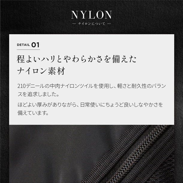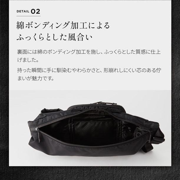 210デニールの中肉ナイロンツイルに綿ボンディング加工を施し、程よいハリと柔らかさを兼ね備えたナイロン素材を使用したショルダーバッグです。