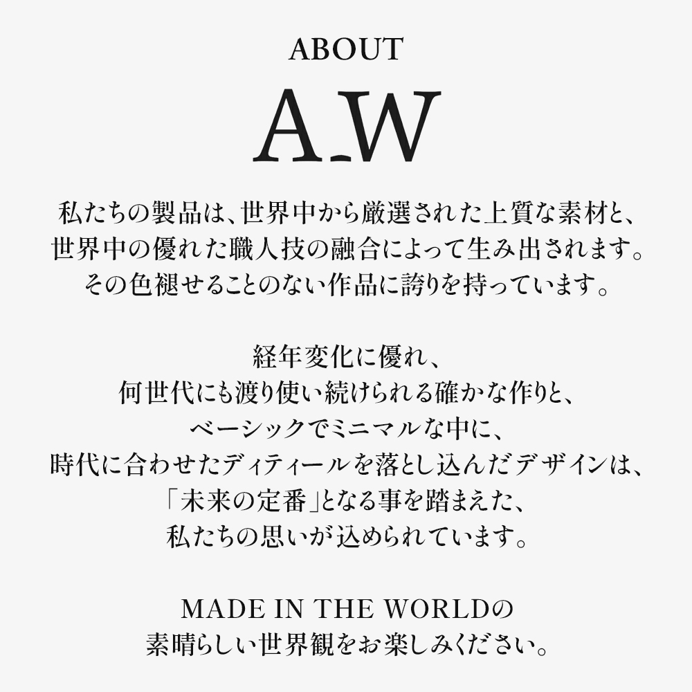 経年変化に優れ、何世代にも渡り使い続けられる確かな作りと、ベーシックでミニマルな中に時代に合わせたディティールを落とし込んだデザインは、「未来の定番」となる事を踏まえた、私たちの思いが込められています。