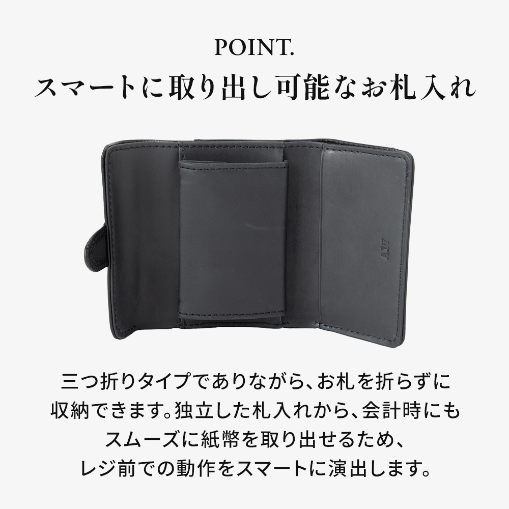 三つ折りタイプながら、お札入れが1つありお札は折りたたまず、そのまま収納できます。