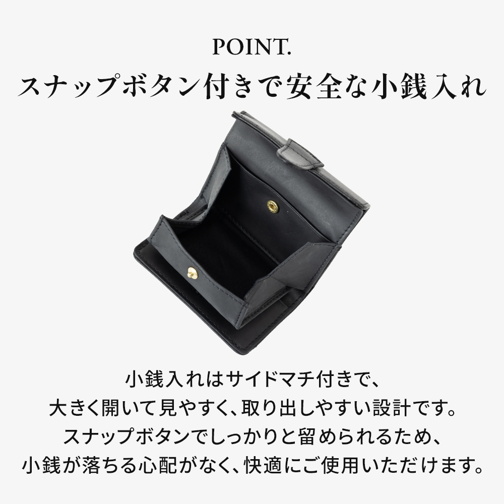 さらに、小銭入れ部分にはスナップボタンが付いている為、小銭が落ちてしまうことなく安心して使っていただけます。