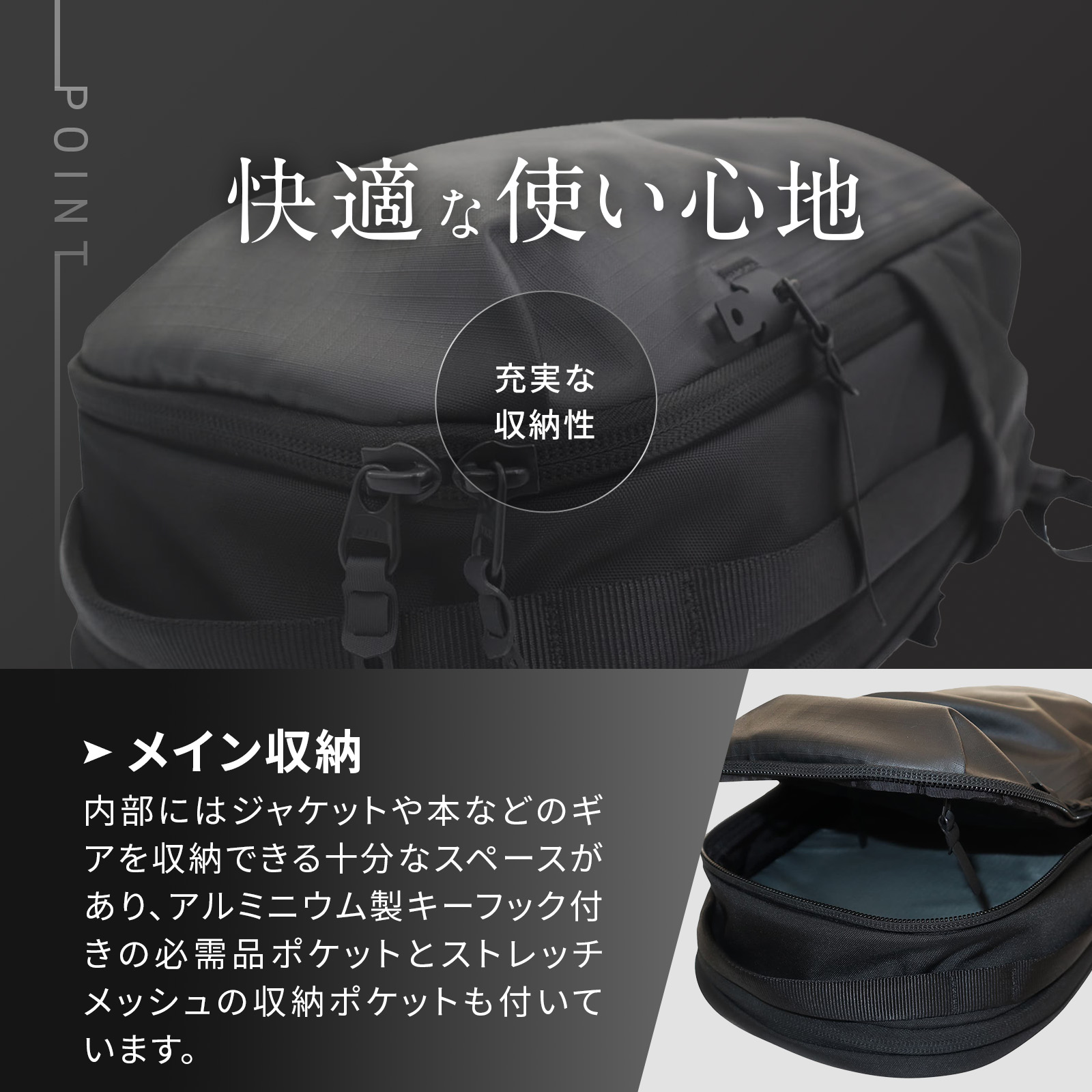 内部にはジャケットや本などのギアを収納できる十分なスペースがあり、アルミニウム製キーフック付きの必需品ポケットとストレッチメッシュの収納ポケットも付いています。