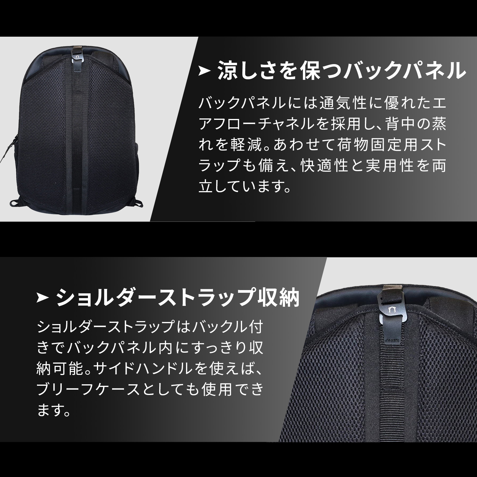 ショルダーストラップにはバックルが付いておりバックパネルの内側に収納でき、サイドハンドルを使用しブリーフスタイルでも使用可能です。