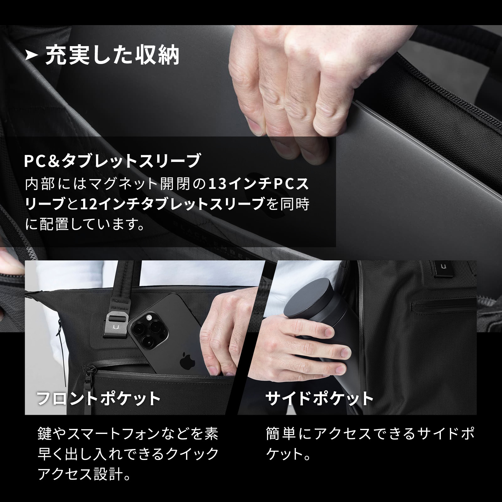 内部にはマグネット開閉の13インチPCスリーブと12インチタブレットスリーブ、簡単にアクセスできるポケットを複数配置しています。