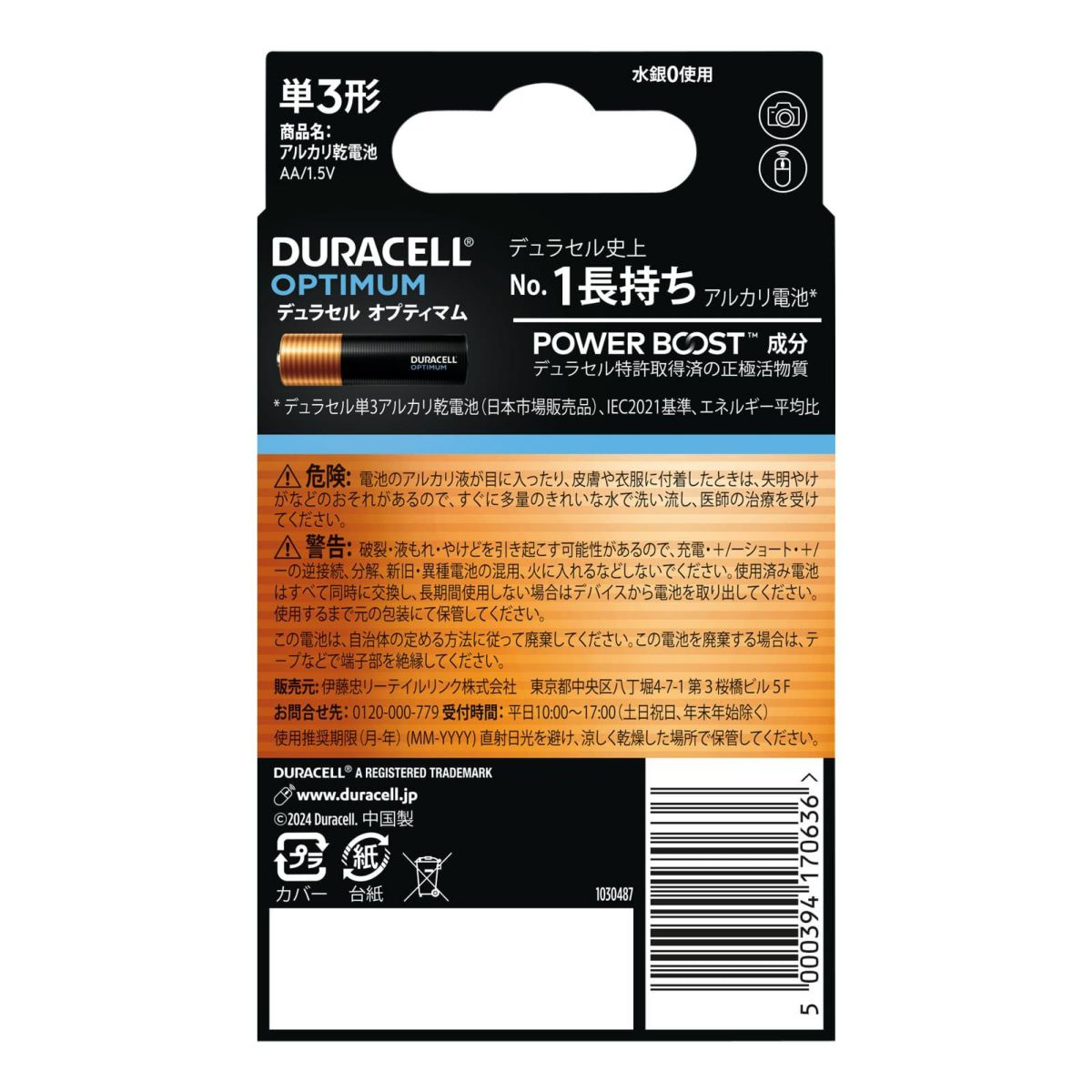 【DURACELL デュラセル】 アルカリ乾電池 単3形 48本入り (4本×12セット) OPTIMUM オプティマム