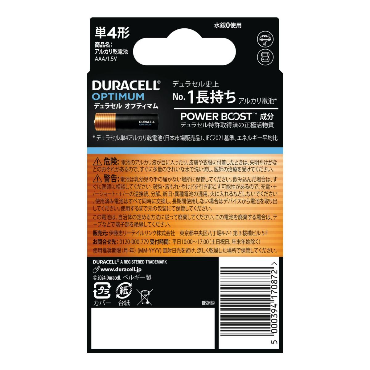 【DURACELL デュラセル】 アルカリ乾電池 単4形 48本入り (4本×12セット) OPTIMUM オプティマム